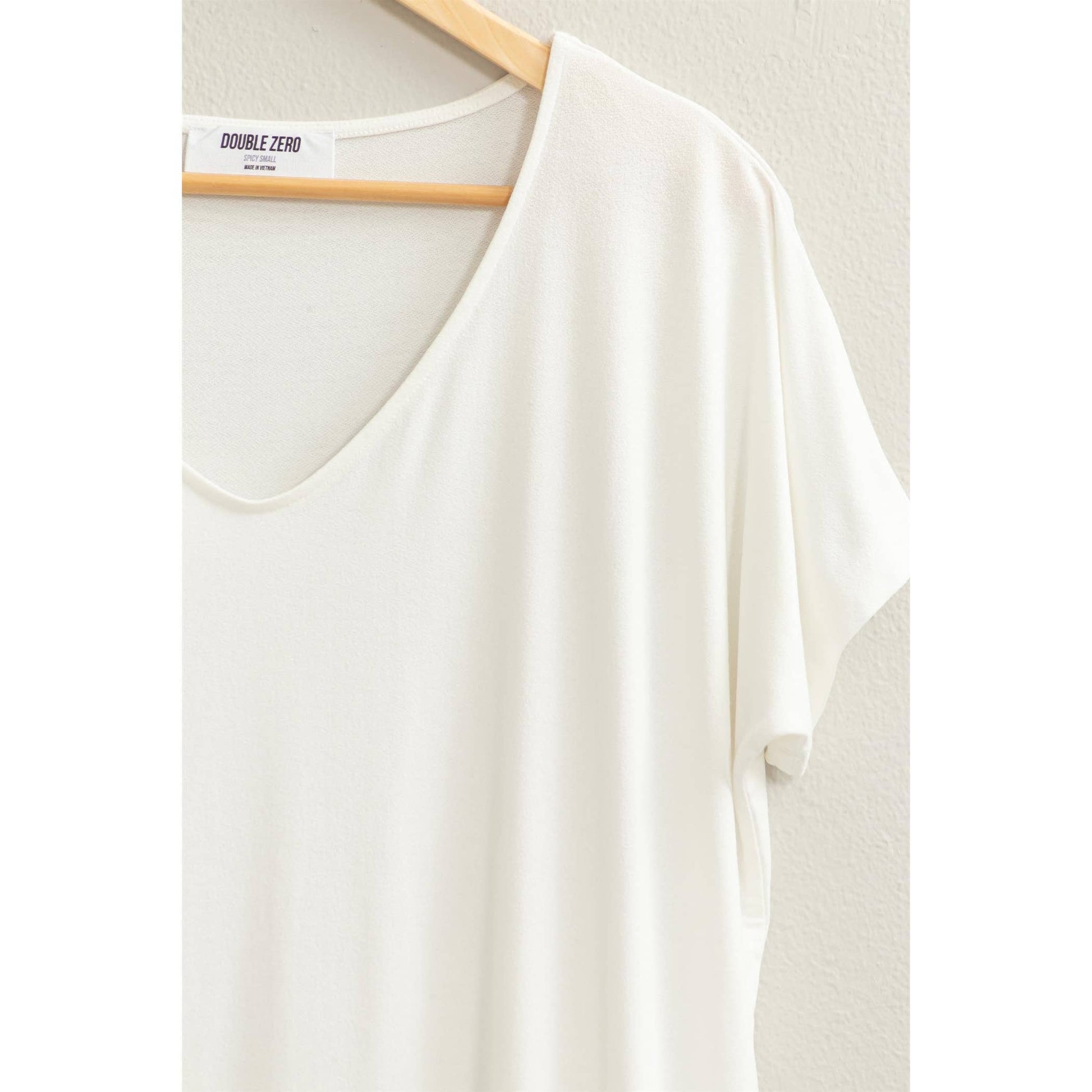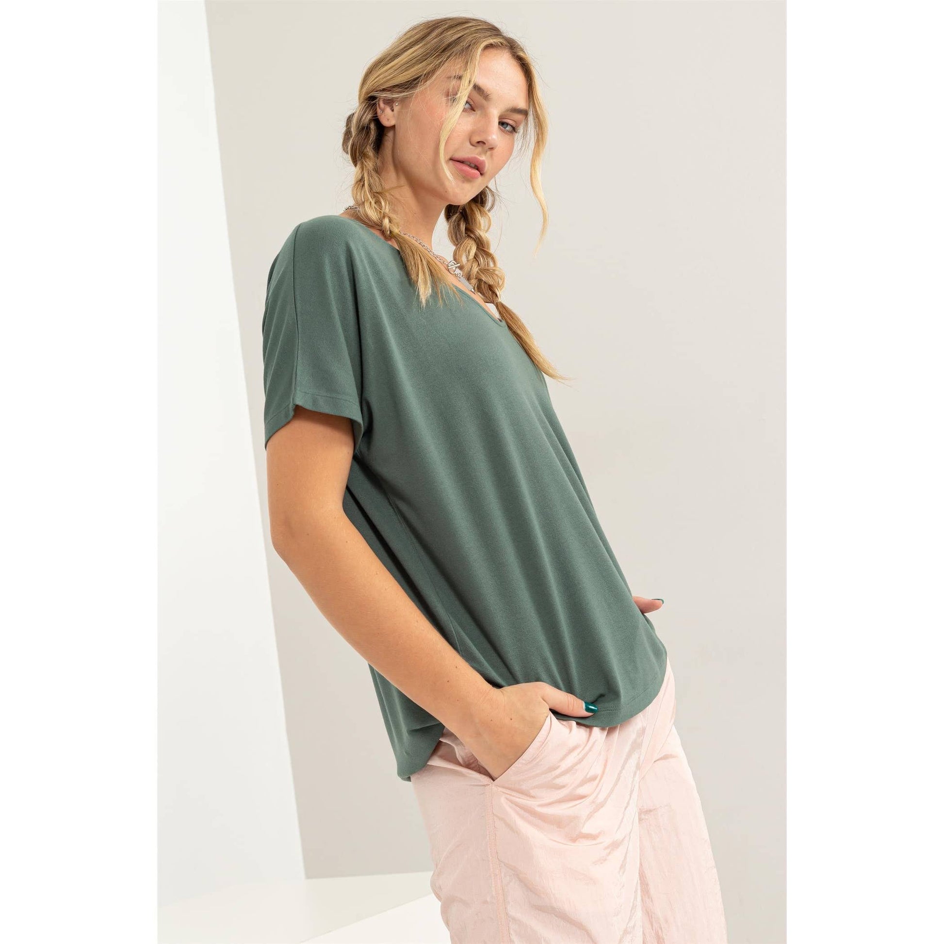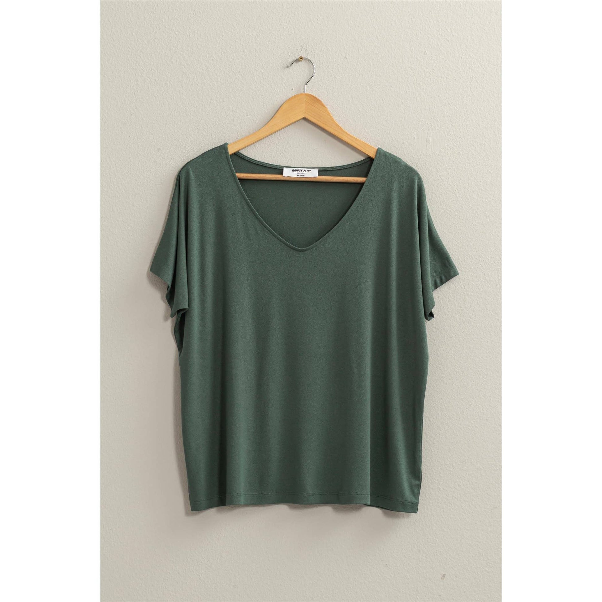 ALL YOUR CASUAL DAY FITS NEED A TOP AS CUTE AS THIS ONE. MADE FROM LIGHTWEIGHT AND SUPER SOFT MATERIAL, THIS TOP FEATURES A V NECKLINE, SHORT SLEEVES AND A RELAXED FIT. STYLE WITH MOM JEANS FOR A BASIC OOTD. 95% RAYON 5% SPANDEX WEAR WITH/ GRAY GREEN: BOTTOM DZ24C809 ORANGE: BOTTOM DZ24A854 TAN: BOTTOM DZ24C815 MODEL IS 5' 9" TALL, 32" CHEST, 23" WAIST AND 35" HIPS AND WEARING A SIZE SMALL IMPORTED. DESIGNED IN THE USA
