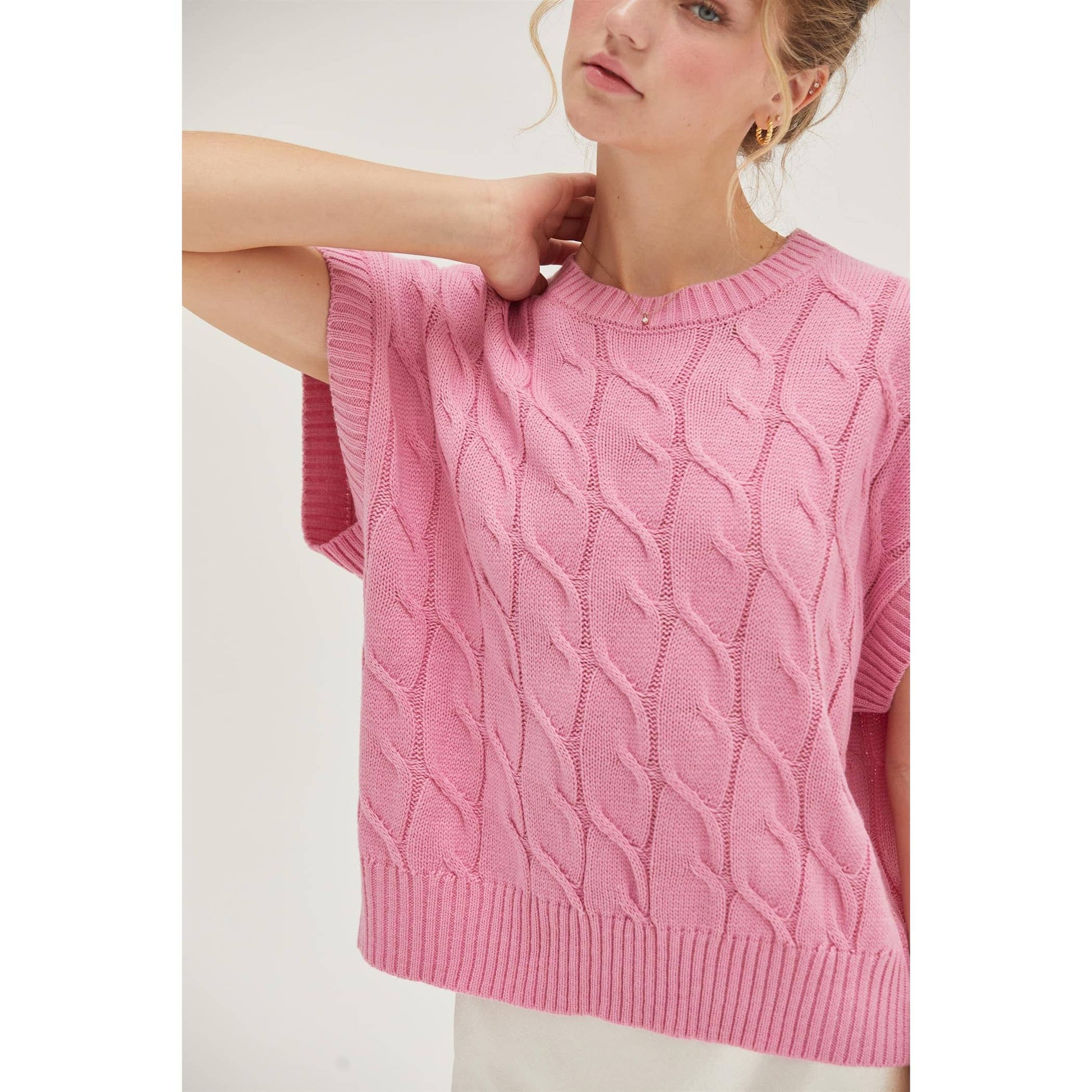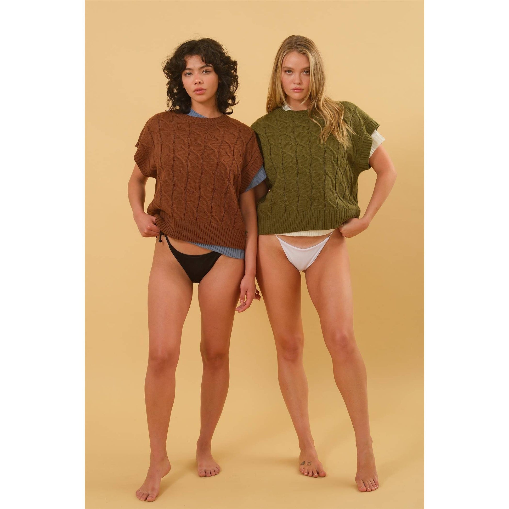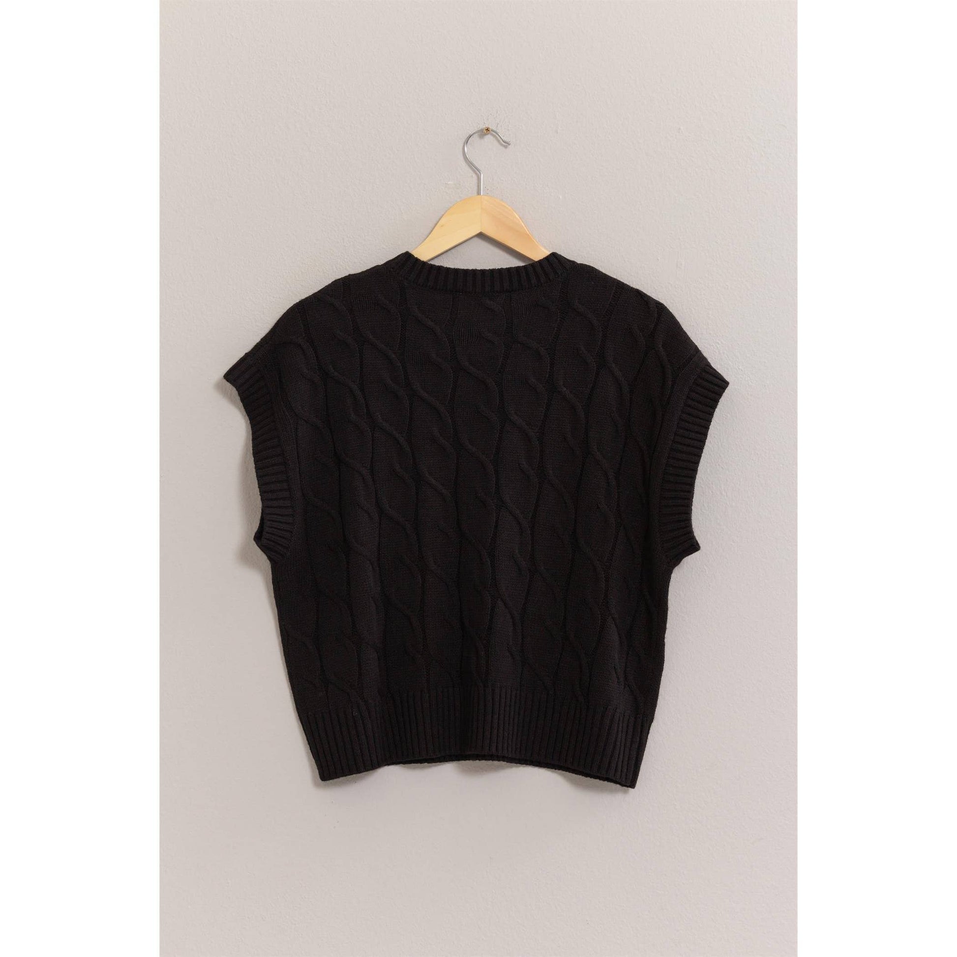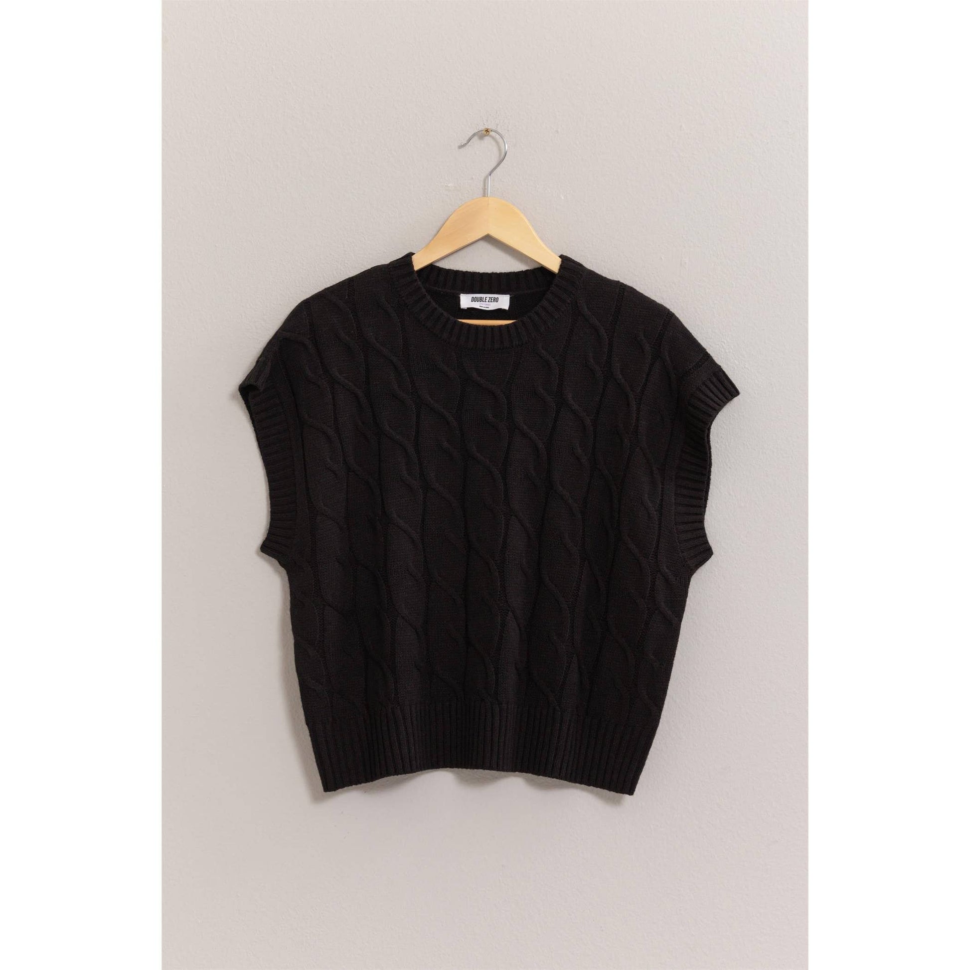 ELEVATE YOUR LOOK WITH THIS CHIC CABLE KNIT SLEEVELESS SWEATER. FEATURING A CLASSIC CABLE KNIT PATTERN AND A RELAXED, BOXY FIT, THIS SWEATER OFFERS BOTH COMFORT AND STYLE. THE SLEEVELESS DESIGN MAKES IT PERFECT FOR LAYERING OVER LONG-SLEEVE SHIRTS OR WEARING ALONE ON WARMER DAYS. PAIR IT WITH YOUR FAVORITE JEANS OR A SKIRT FOR A TRENDY, VERSATILE OUTFIT. 100% ACRYLIC MODEL IS 5' 9" TALL, 32" CHEST, 23" WAIST AND 35" HIPS AND WEARING A SIZE SMALL
