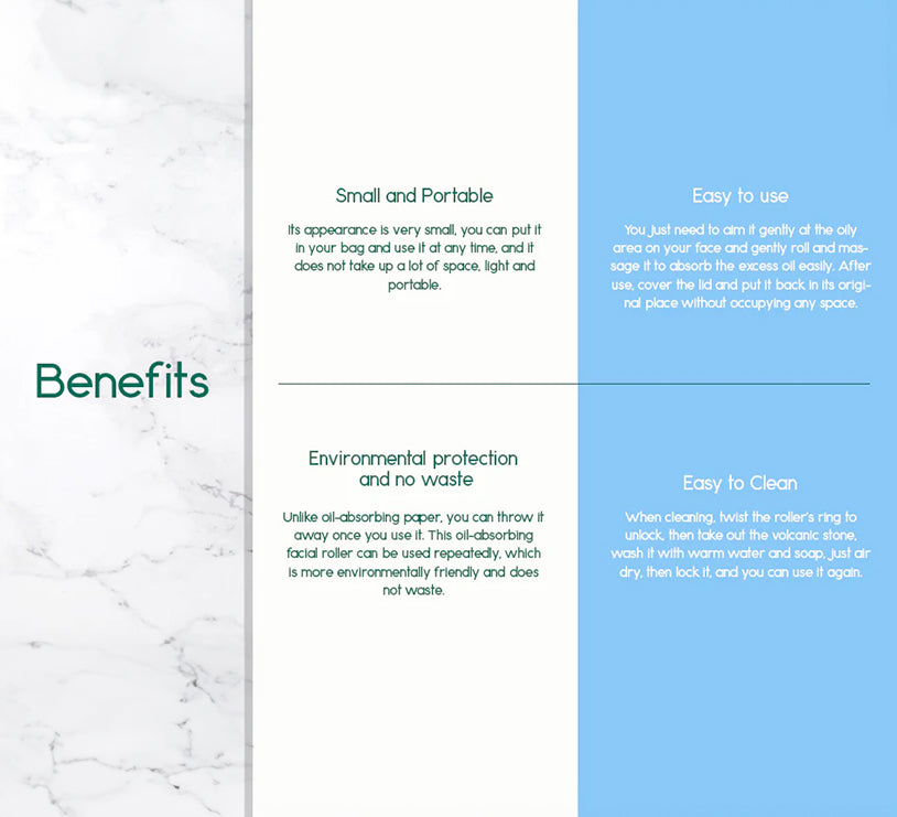 Our innovative face roller is crafted from genuine, natural volcanic stone, famous for its exceptional oil-absorbing power. Just a few gentle rolls instantly wick away excess facial oil and grease, revealing a clean, matte complexion without disturbing your makeup.